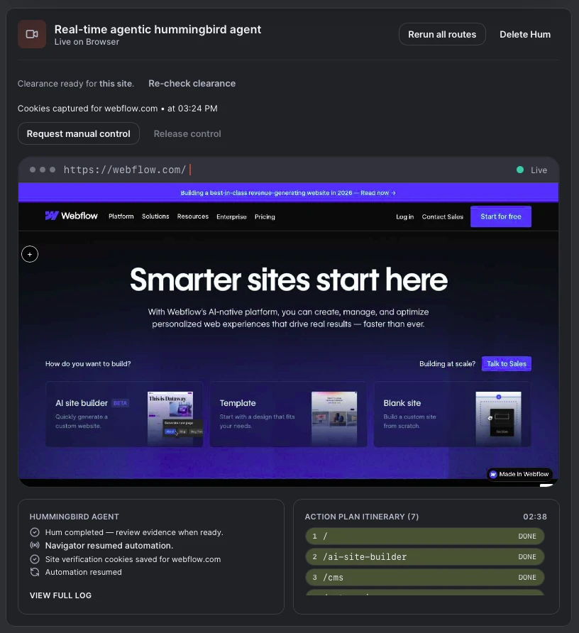 Hummingbird monitors production UI changes, captures product visuals and visual diffs, and turns every Hum into a proof-backed story you can share across Marketing, Docs, and Sales. Request a workspace invite in Run Hum or review per-Feather pricing when you're ready to scale.