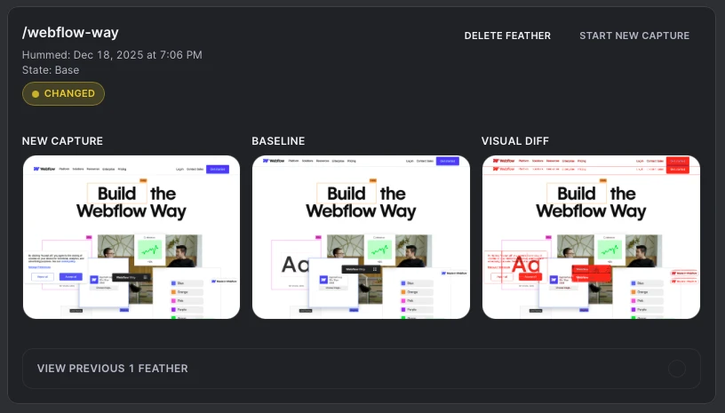 When a UI change lands in production, Start humming captures Feathers (Route × Device × Capture‑Set) with product visuals and visual diffs. You review what changed, promote the baseline, then Publish a stable, evidence-linked bundle in under two minutes.