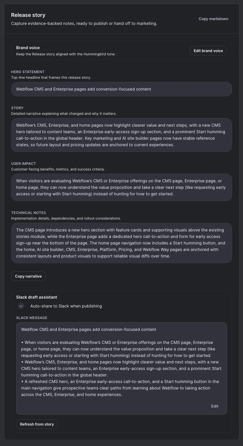 Each Hum keeps product visuals, visual diffs, narrative drafts, and reviewer notes in one place. Share the bundle or send it to Slack so Marketing, Sales, Product, and QA stay aligned.